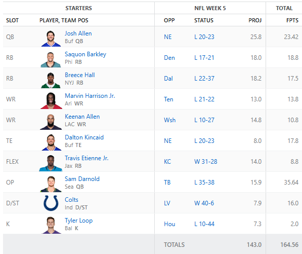 There are definitely some misses on wide receiver but that is always such a hit or miss position. What shocked me the most was Josh Allen only get 11 points. Also, J.J. McCarthy was injured in his game. Not a single player hit their projection except for the Rams’ defense. If we take a look at the bench there are definitely some better picks we could have made strictly from looking at points for the game. However, even if we had selected all the better preforming players the team would have still lost as our opponent had 164 points this week.