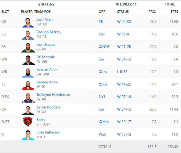 Wow. Week 11 was filled with injuries. Josh Jacobs went down early with a knee injury. Aaron Rogers went out with a wrist injury but it all started off with an epic performance by TreVeyon Henderson putting up 32.3 points. The end result of week 11? ANOTHER VICTORY FOR AI! The team is now in 1st place. With all those injuries you might be wondering how we pulled off another victory. Well, here is the final scores for the week: