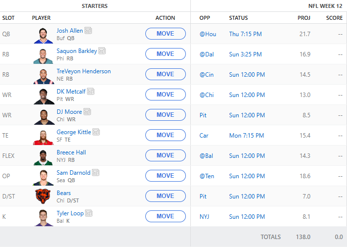 Looking forward to week 12, we will have to battle some injuries but I think the depth chart should be able to sustain the blows. Here is the current proposed lineup: