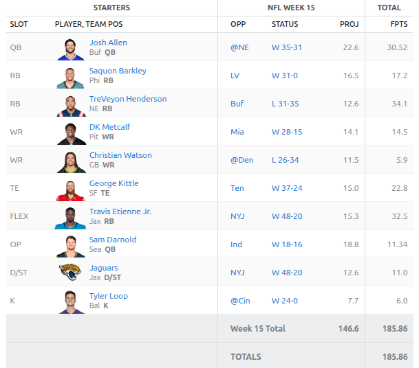 I ran the AI on Saturday and it suggested pulling out Josh Jacobs in favor of TreVeyon Henderson. This ended up getting us an extra 10 points. Josh Jacobs still put up 24.2 points this week. Everyone played really well this week except Sam Darnold. I’m not sure if his hot streak is over or what is going on with him but its been rough. Christian Watson took a nasty hit in his game and left early but he is expected to be just fine.