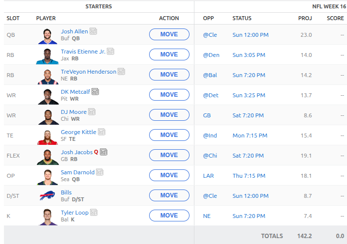 So, did we win? We sure did! We’re on to the next round of the playoffs and we’re going to be up against Jahmyr Gibbs so we have to hope for our best performance of the season next week. Here is the currently proposed roster: