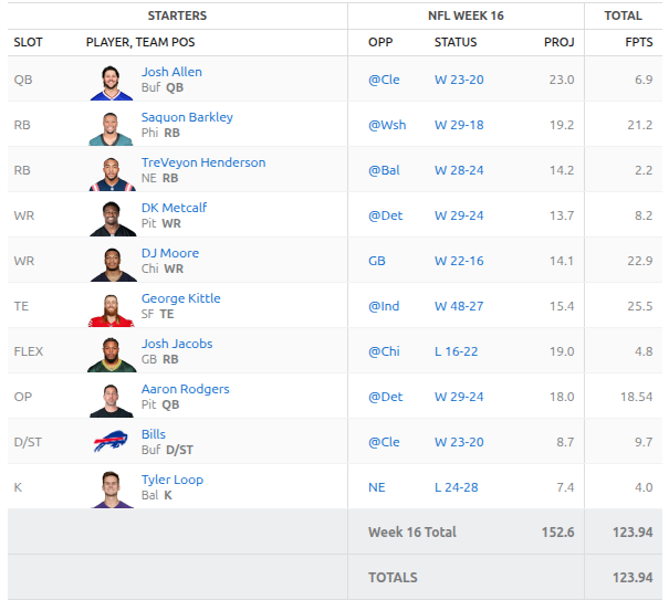 I think the AI mostly selected correctly this week. Unfortunately it wasn’t enough. We fell short by about 5 points. Going into Monday night we needed a massive game from George Kittle as the rest of the team performed very poorly. He delivered all the way until the 4th quarter where he likely twisted his ankle and was done for the game as the 49ers were up 2 scores.