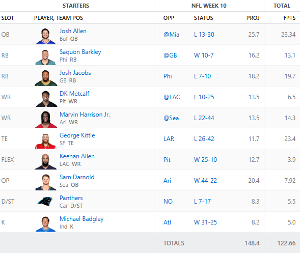 Well, week 10 has completed. And, WE WON AGAIN! It was a close one that came down to Monday Night Football. I had to buy a day pass to SlingTV so that I could watch the game due to the Youtube TV and Disney dispute. But, Josh Jacobs squared off against Saquon Barkley in the most BORING of football games. At any point in time, if AJ Brown had scored a touchdown I think we would have lost the matchup. Here are the final results.