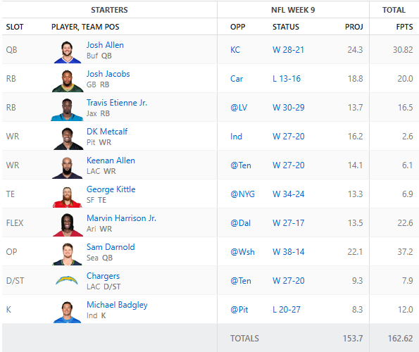A BIG win in week 9! Our team is now tied for 1st place with 6 wins and 3 losses. We currently have 1318.66 total fantasy points on the season. It was looking pretty grim going into the afternoon games on Sunday. The receivers AI selected were not preforming and other players were barely hitting their projects. Josh Allen sparked some life into the team with his 30 points and then Sam Darnold showed everyone how to play quarter back with a 37.2 point performance! Check out the full results below.