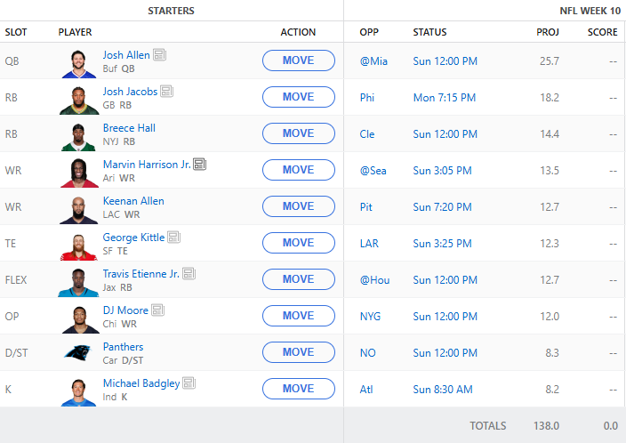 So, now we’re off to week 10. Currently, as I write this, Saquon Barkley is questionable to play. I would expect that he does play but the AI will not put him in the starting lineup. We picked up the Panther’s defense upon request from the AI. I would expect this is because they are playing the Saints who just traded away Rasheed Shaheed. The addition of DJ Moore into the OP slot is going to be a rough choice over playing a quarterback in that position. I’ll be monitoring the roster throughout the week to see if there are any other suggestions we can make. Here is what we are currently fielding into week 10:
